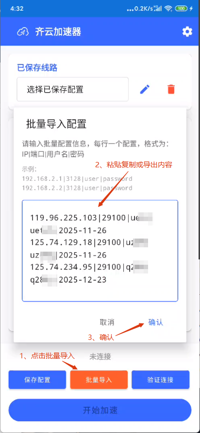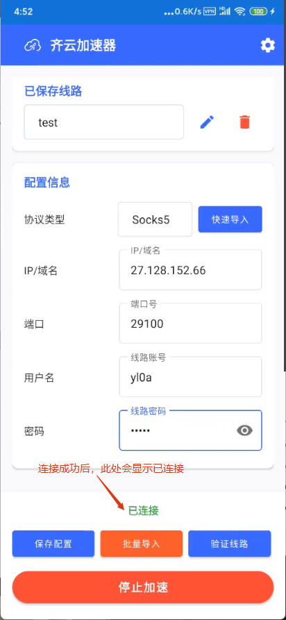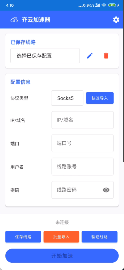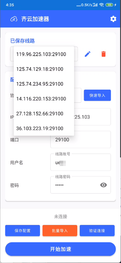 (4)导入成功后点击已保存线路,即可快速选择导入的IP节点连接使用